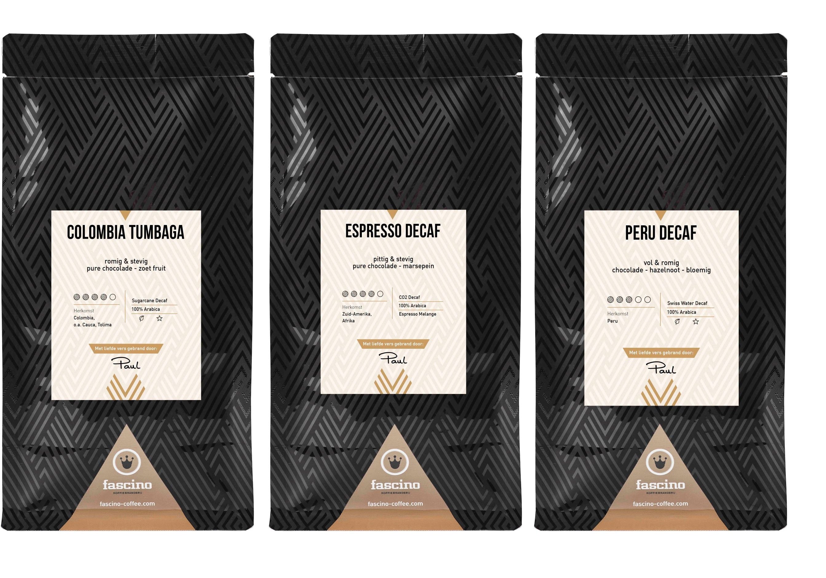 Dit decaf proefpakket bestaat uit 3 x 250 gram cafeïnevrije koffiesoorten